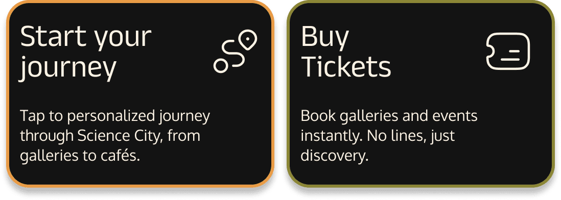 A clear, accessible design system built to reduce cognitive load and support effortless navigation. Consistent layouts, intuitive icons, and warm, contextual visuals guide visitors through Science City with confidence.